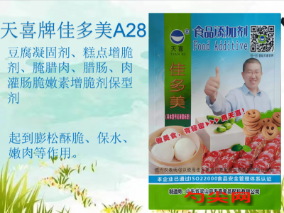 ★商品名:天喜牌佳多美A28型  產品名稱:佳多美牌復配水分保持膨松劑4 型號:JDM-A28 本品按照《食品安全國家標準 食品添加劑使用標準GB2760》及補充規定的品種、應用分類、使用范圍、最大使用量、殘留量等科學組方,并且按照《食品安全國家標準 復配食品添加劑通則GB26687》精心配制而成。本品已經通過食品生產許可,保障食品安全。用戶按照本說明的用法用量生產制作的熟制堅果與籽類(僅限油炸堅果與籽類)(食品分類號:04.05.02.01)、小麥粉及其制品(表A3中例外的食品除外)(食品分類號:06.03)、面糊(如用于魚和禽肉的拖面糊)、裹粉、煎炸粉(食品分類號:06.03.02.04)、食用淀粉(食品分類號:06.05.01)、即食谷物,包括碾軋燕麥(片) (食品分類號:06.06)、方便米面制品(食品分類號:06.07)、冷凍米面制品(食品分類號:06.08)、焙烤食品(食品分類號:07.0)、膨化食品(食品分類號:16.06)、預制肉制品(食品分類號:08.02)、熟制肉制品(食品分類號:08.03)、冷凍水產品(食品分類號:09.02.01)、冷凍魚糜制品(食品分類號:09.02.03)既不會超標也不會超量。