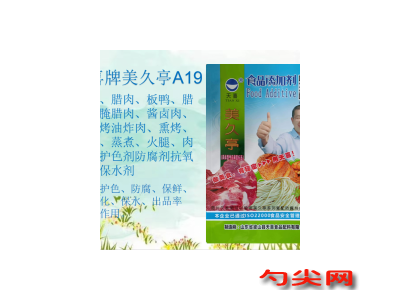 ★商品名:天喜牌美久亭A19型 產品名稱:美久亭牌復配抗氧化護色劑3 型號:MJT-A19本品按照《食品安全國家標準 食品添加劑使用標準GB2760》及補充規定的品種、應用分類、使用范圍、最大使用量、殘留量等科學組方,并且按照《食品安全國家標準 復配食品添加劑通則GB26687》精心配制而成。本品已經通過食品生產許可,保障食品安全。用戶按照本說明的用法用量生產制作的腌臘肉制品類(如咸肉、臘肉、板鴨、中式火腿、臘腸)(食品分類號:08.02.02)、醬鹵肉制品類(食品分類號:08.03.01)、熏、燒、烤肉類(食品分類號:08.03.02)、油炸肉類(食品分類號:08.03.03)、西式 火腿 (熏烤、煙熏、蒸煮火腿)類(食品分類號:08.03.04)、肉灌腸類(食品分類號:08.03.05)、發酵肉制品類(食品分類號:08.03.06)、肉罐頭類(食品分類號:08.03.08)既不會超標也不會超量。