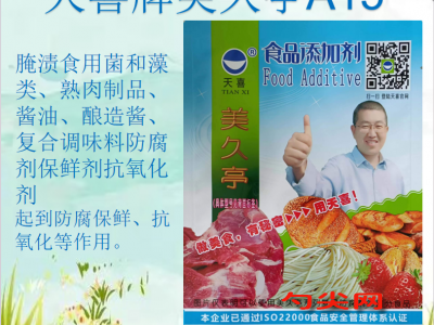 ★商品名:天喜牌美久亭A15型  產品名稱:美久亭牌復配防腐劑16 型號:MJT-A15本品按照《食品安全國家標準 食品添加劑使用標準GB2760》及補充規定的品種、應用分類、使用范圍、最大使用量、殘留量等科學組方,并且按照《食品安全國家標準 復配食品添加劑通則GB26687》精心配制而成。本品已經通過食品生產許可,保障食品安全。用戶按照本說明的用法用量生產制作的腌漬的食用菌和藻類(食品分類號:04.03.02.03)、熟肉制品(食品分類號:08.03)、醬油(食品分類號:12.04)、釀造醬(食品分類號:12.05)、復合調味料(食品分類號:12.10)既不會超標也不會超量。