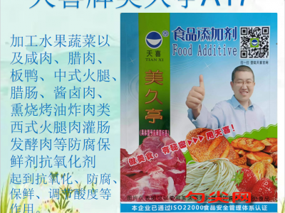 ★功能作用:〔美久亭A17型〕用于番茄醬、果醬、蔬菜泥醬、果糕、果干、蜜餞涼果、山楂卷、山楂條、山楂糕、加工水果、加工蔬菜、腌臘肉制品類(如咸肉、臘肉、板鴨、中式火腿、臘腸) 、醬鹵肉制品類、熏、燒、烤肉類、油炸肉類、西式 火 腿 (熏烤、煙熏、蒸煮火腿)類、肉灌腸類、發酵肉制品類等食品,起到抗氧化、防腐、保鮮、調節酸度等作用。〔美久亭A17型〕還可用于辣椒酥、果糕、蘋果醬、山楂卷等,起到防腐保鮮作用。