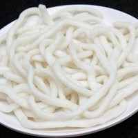 ①.干粉條、寬粉配方:土豆(木薯、紅薯、芋頭等)淀粉100斤、筋力源T型0.3-0.6斤、30度溫水(也可以全部用熱水)50-60斤(淀粉品種不同加水量不同)。工藝:將筋力源與5斤淀粉(芡粉)干拌均勻,用2-3斤溫水調(diào) 粉,沖入開水10斤打成芡糊,再用[電鉆攪拌器]高速攪拌成均勻糊狀。將打好的熱芡糊與其它95斤淀粉和勻,再加其余溫水和成粉團(tuán)。降溫至25度放入漏粉機(jī),將粉條漏入開水鍋內(nèi)煮熟,粉條飄上來以后馬上撈入涼水降溫。或?qū)⒎蹐F(tuán)放入自熟機(jī)(自熟機(jī)添加0.3%)加工成粉條,將加工好的粉條用風(fēng)扇降溫。然后,熟化陰干8-12小時(shí)或冷凍、浸泡、搓開、曬干、包裝。