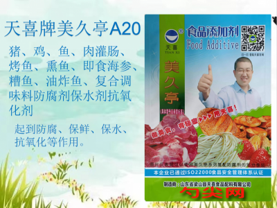 ★功能作用:〔美久亭A20型〕用于豬肉灌腸、雞肉灌腸、魚肉灌腸、烤魚、熏魚、即食海參、糟魚、油炸魚、蝦醬、熟海蜇、炸魚皮、烤魚片、烤蝦等肉灌腸類、熟制水產品、復合調味料,起到防腐、保鮮、保水、抗氧化等作用。對于烤、炸魚類蝦類,還有肉質細嫩、口感酥脆的作用。