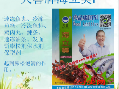 ★功能作用:〔海立美F型〕用于速凍魚丸、冷凍魚糕、冷凍魚排、雞肉丸、辣條、速凍油條、發面餅等發酵面制品、方便米面制品;冷凍米面制品、預制肉制品、熟制肉制品、冷凍水產品、冷凍魚糜制品、熱凝固蛋制品(如蛋黃酪、松花蛋腸、焙烤食品,起到膨松飽滿的作用。〔海立美F型〕還可由于速凍黑魚片等。