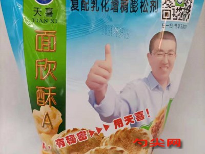 ★天喜牌面欣酥A型 產品名稱:面欣酥牌復配乳化增稠膨松劑 型號:MXS-A 本品按照《食品安全國家標準 食品添加劑使用標準GB2760》及補充規定的品種、應用分類、使用范圍、最大使用量、殘留量等科學組方,并且按照《食品安全國家標準 復配食品添加劑通則GB26687》精心配制而成。本品已經通過食品生產許可,保障食品安全。用戶按照本說明的用法用量生產制作的裹粉(食品分類號:06.03.02.04)、油炸面制品(食品分類號:06.03.02.05)、焙烤食品(食品分類號:07.0)既不會超標也不會超量。
