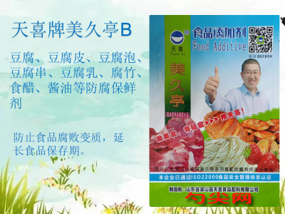 ★商品名:天喜牌美久亭B 產品名稱:美久亭牌復配防腐劑2 型號:MJT-B 本品按照《食品安全國家標準 食品添加劑使用標準GB2760》及補充規定的品種、應用分類、使用范圍、最大使用量、殘留量等科學組方,并且按照《食品安全國家標準 復配食品添加劑通則GB26687》精心配制而成。本品已經通過食品生產許可,保障食品安全。用戶按照本說明的用法用量生產制作的豆類制品(食品分類號:04.04)、食醋(食品分類號:12.03)、醬油(食品分類號:12.04)既不會超標也不會超量。