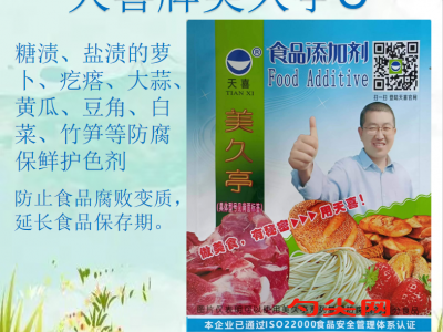 ★商品名:天喜牌美久亭C 產品名稱:美久亭牌復配防腐劑3 型號:MJT-C 本品按照《食品安全國家標準 食品添加劑使用標準GB27604》及補充規定的品種、應用分類、使用范圍、最大使用量、殘留量等科學組方,并且按照《食品安全國家標準 復配食品添加劑通則GB26687》精心配制而成。本品已經通過食品生產許可,保障食品安全。用戶按照本說明的用法用量生產制作的腌漬的蔬菜(食品分類號:04.02. 02.03)既不會超標也不會超量。