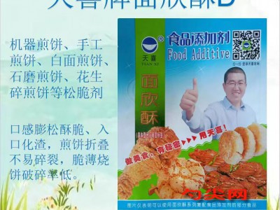 ★功能作用:采用本品加工制作的手工白面煎餅、機器白面煎餅、石磨煎餅、花生碎煎餅以及以小麥粉為主的混合粉煎餅等焙烤食品、裹粉、油炸面制品口感膨松酥脆、入口化渣,煎餅折疊不易碎裂,脆薄燒餅破碎率低。各類雜糧煎餅可以添加泡多源K型。 〔面欣酥D型〕還可用于松脆煎餅果子、花生夾心薄煎餅、松脆菜煎餅、酥脆白面煎餅等。