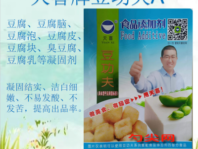 ★商品名:天喜牌豆功夫A型  產(chǎn)品名稱:豆功夫牌復(fù)配豆類制品凝固劑 型號:DGF-A  本品按照《食品安全國家標(biāo)準(zhǔn) 食品添加劑使用標(biāo)準(zhǔn)GB2760》及補(bǔ)充規(guī)定的品種、應(yīng)用分類、使用范圍、最大使用量、殘留量等科學(xué)組方,并且按照《食品安全國家標(biāo)準(zhǔn) 復(fù)配食品添加劑通則GB26687》精心配制而成。本品已經(jīng)通過食品生產(chǎn)許可,保障食品安全。用戶按照本說明的用法用量生產(chǎn)制作的豆類制品(食品分類號:04.04)既不會超標(biāo)也不會超量。