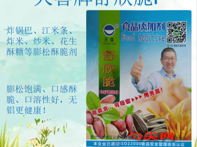 ★商品名:天喜牌舒欣脆F型 產品名稱:舒欣脆牌復配酶制膨松劑 型號:SXC-F 本品完全按照《食品安全國家標準 食品添加劑使用標準GB2760》及補充規定的品種、應用分類、使用范圍、最大使用量、殘留量等科學組方,并且按照《食品安全國家標準 復配食品添加劑通則GB26687》精心配制而成。本品已經通過食品生產許可,保障食品安全。用戶按照本說明的用法用量生產制作的 各類食品(配料表中成分在GB2760表A.1中有限量要求的食品 除外;配料表中成分在GB2760表A.3中所例外的食品除外)既不會超標也不會超量。