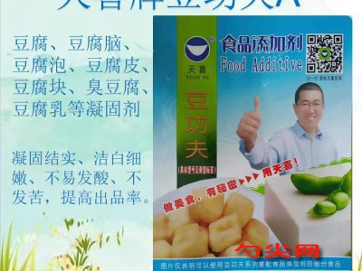 ★商品名:天喜牌豆功夫A型 產品名稱:豆功夫牌復配豆類制品凝固劑 型號:DGF-A 本品按照《食品安全國家標準 食品添加劑使用標準GB2760》及補充規定的品種、應用分類、使用范圍、最大使用量、殘留量等科學組方,并且按照《食品安全國家標準 復配食品添加劑通則GB26687》精心配制而成。本品已經通過食品生產許可,保障食品安全。用戶按照本說明的用法用量生產制作的豆類制品(食品分類號:04.04)既不會超標也不會超量。