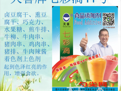 ★商品名:天喜牌七彩滴11號 產(chǎn)品名稱:七彩滴牌復配著色劑7 型號:QCD-11 本品按照《食品安全國家標準 食品添加劑使用標準GB2760》及補充規(guī)定的品種、應用分類、使用范圍、最大使用量、殘留量等科學組方,并且按照《食品安全國家標準 復配食品添加劑通則GB26687》精心配制而成。本品已經(jīng)通過食品生產(chǎn)許可,保障食品安全。用戶按照本說明的用法用量生產(chǎn)制作的豆干再制品(食品分類號:04.04.01.03)、可可制品、巧克力和巧克力制品, 包括代可可脂巧克力及制品(食品分類號:05.01)、糖果(食品分類號:05.02)、面糊(如用于魚和禽肉的拖面糊)、裹粉、煎炸粉(食品分類號:06.03.02.04)、調(diào)理肉制品(生肉添加調(diào)理料) (食品分類號:08.02.01)、醬及醬制品(食品分類號:12.05)、復合調(diào)味料(食品分類號:12.10)既不會超標也不會超量。